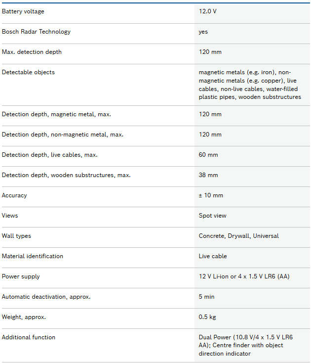 The D-tect 120 Professional offers a simple user interface with three self-explanatory selection buttons for adjusting to various applications and it is able to detect objects at depths of up to 12 cm. Audio and visual signals notify the user when objects are detected in the wall.