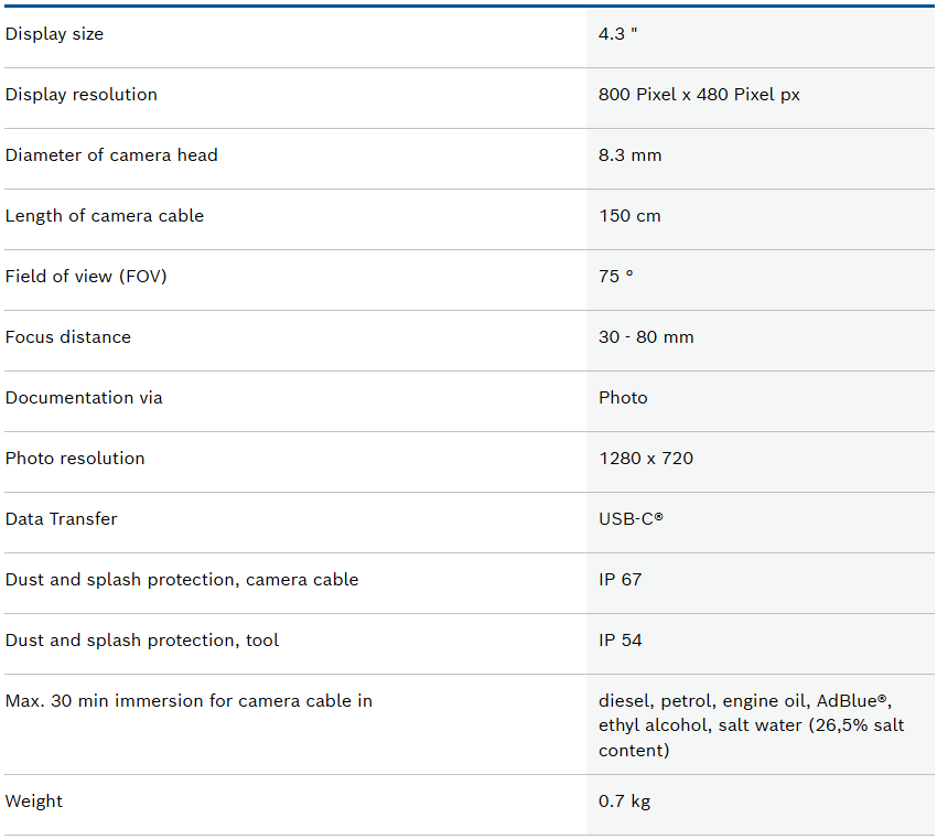 The GIC 12V-4-23 C Professional inspection camera is the ideal tool for HVAC/plumbers, car mechanics, or electricians. It has a large 4.3ā monitor that displays clear, high-definition images of 800 x 480 pixels, enabling quick and intuitive analysis of pipes, ducts, or other hard-to-reach areas. Image orientation is easily determined thanks to the handy Up Indication feature that always points upwards. This ergonomic camera is robustly designed for use on tough jobsites and hard-to-reach spaces. It comes with an IP67 rating for the camera head, protecting it from dust and short periods of immersion in water, and IP54 dust and splash water protection for the tool.